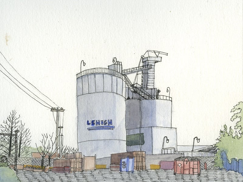 Watercolor sketch of a cement plant at the Brooklyn Rail Yard in Portland, OR.