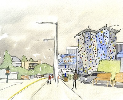 Printable watercolor painting of the Lock Spot Cafe sign on 54th Avenue. Edge Works Climbing Gym's outdoor wall is in the background.