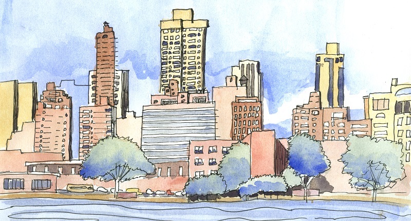 Printable watercolor painting of the New York City skyline from Long Island City in the Queens Borough